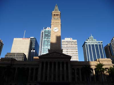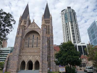 Le jeudi 24 juin fut la première journée de visite de Brisbane dont le centre est dans un méandre de la Brisbane River aux rues en grille orientées quasiment nord-sud dont les noms sont ceux des reines et des princesses et est-ouest ceux des rois et princes bien sûr du British Raj. En flânant je rendis visite à l’agence consulaire de France dans Edward St où je fus cordialement et chaleureusement reçu. Puis ce fut un tour des bâtiments anciens coincés entre les immeubles modernes de verre et d’acier comme dans les autres capitales. La circulation automobile est fluide car les parkings sont coûteux ainsi les bus circulent aisément. En débarquant de celui venant de Newmarket l’Hôtel de Ville impose sa Tour de la Cloche de style italien. La cathédrale catholique St Stephen possède de très beaux vitraux. |