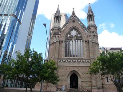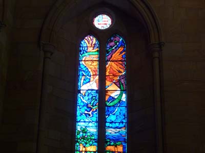 Je revins sur Ann St pour m’arrêter longuement à la cathédrale anglicane St Jean qui fut construite en 1888 selon une architecture gothique française. La nef sur croisé d’ogive est remarquable de finesse. Des vitraux modernes aux couleurs vives attirent les rayons du soleil en fin d’après-midi tel celui commémorant l’amitiés entre l’Australie et les USA qui lui ont épargné une invasion japonaise. D’ailleurs l’alignement de la politique étrangère de l’Australie témoigne de sa reconnaissance. |