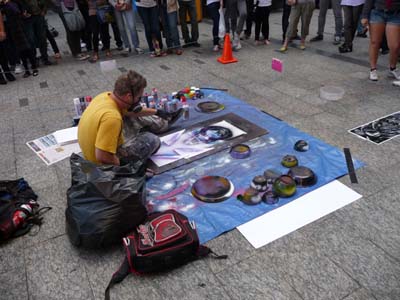 En route vers Adelaide St pour le bus de retour je m’arrêtais au Commissariat Store Museum qui fut construit en 1829 par les bagnards. La chaussée du Mall de Queen St est occupée par des saltimbanques dont un peintre avec des bombes de peinture. |