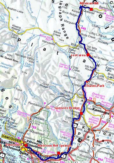 A partir de Lytton la Hwy 97 prend le nom de Cariboo Hwy et est un lieu historique –Gold Rush Trail– dont le Zéro est à Lillooet. La route longe la Fraser River dans une magnifique vallée dont chaque bord est parcouru par une voie de chemin de fer. |