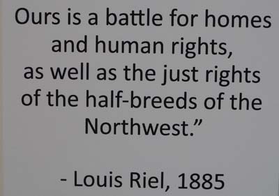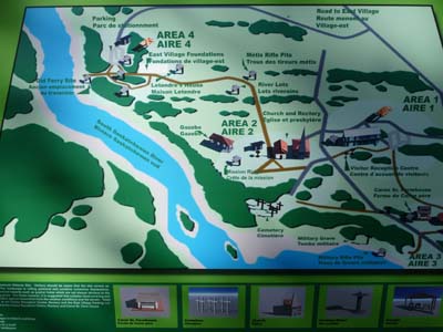 L’objectif de la journée fut de visiter Batoche, lieu historique du Canada, où se déroula une bataille entre les métis et l’armée britannique, une page peu glorieuse de la colonisation britannique, bien que le général Middleton commandant de la force expéditionnaire fut récompensé et devint le gardien des joyaux de la couronne ! Comme avec les Premières Nations le gouvernement d’Ottawa ne respecta jamais avec les métis ni les traités signés ni la parole donnée. Il ne reste que l’église et le presbytère et bien sûr le cimetière où reposent les protagonistes de cette bataille qui opposa 800 soldats puissamment armés à 200 métis équipés de fusils. Un mur d’images avec trois projecteurs met en scène les causes du conflit et la bataille à partir de photos d’époque et d’une reconstitution. Je trouvais un excellent bivouac sur la rive de la Saskatchewan Sud. |