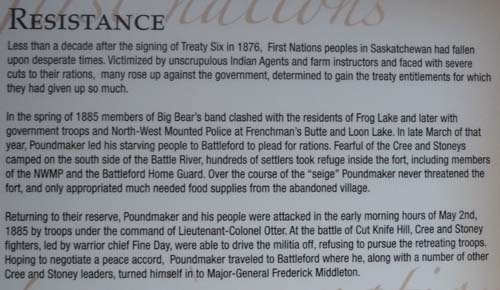 Le Saskatchewan a crée dans ses quatre principales villes, Moose Jaw, North Battleford, Saskatoon et Yorkton des musées thématiques, Saskatchewan Western Development Museum, autour de la colonisation de la province par les européens, WASP ; je ne les visitais pas préférant me concentrer sur l’installation des forts de la Gendarmerie Royale –the Mounties– pour assujettir les Premières Nations et les Métis. Cette histoire commença à Fort Battleford. Comme à Fort Walsh l’Interpretive Centre, installé dans un bâtiment du Fort, retint mon attention. Je présente quelques panneaux significatifs. Là comme en Australie, Tasmanie et Nouvelle Zélande, l’historien canadien a fait le travail de décantation pour citer les faits. La duplicité du gouvernement du Dominion Canadien apparaît dans toute son horreur. Après avoir abattu tous les bisons pour fournir le commerce des fourrures, les Premières Nations, sans subsistance, étaient contraintes de signer des traités léonins qui ne furent jamais honorés. Affamées elles se révoltèrent et furent abattues comme des bisons ; les survivants furent parqués dans des réserves incultes et les chefs pendus haut et court. Certes je résume un peu court, mais enfin la réalité est intangible et les faits sont têtus. |