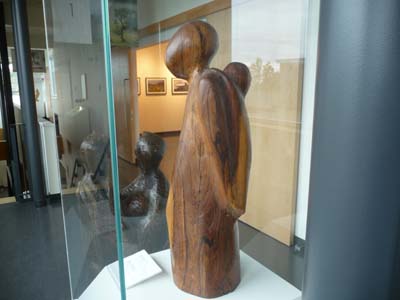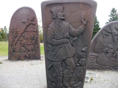 Avant de quitter Gaspé je visitais le petit musée qui présente la vie de la presqu’île de Gaspésie en quelques tableaux et l’arrivée de Jacques Cartier en 1534. Une reproduction de la Croix qu’il planta sur le rivage et un ensemble de stèles en bronze commémorant son arrivée et son dialogue avec les amérindiens sont exposés à l’extérieur. Le musée présente aussi des œuvres de Suzanne Guité, sculpteur, qui fit son tour du monde pour apprendre son art. Elle séjourna à Percé où j’arrivais en fin de matinée sous un ciel plombé. |